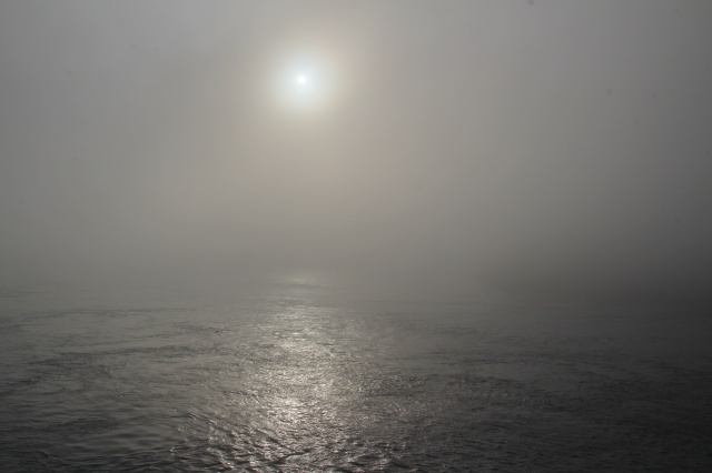 翌朝は6時半に起床。今朝は海に濃霧が発生していて視界が悪い。東山魁夷とかがそのまま絵画にしそうな状況。名付けて「海霧日照」。