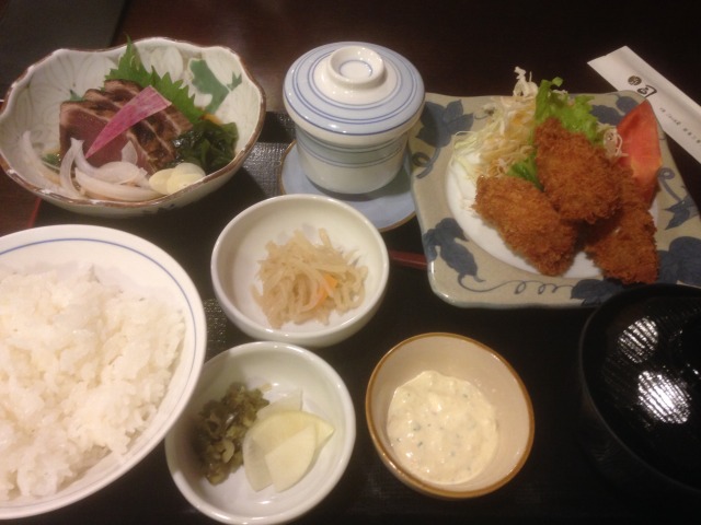 翌朝は7時頃に起床すると、そのまま新幹線で関西に戻る。朝食は車内で弁当。大阪には昼前に到着するので、昼食は「疲れた時の牡蠣フライ」というわけで、阪急地下の「土佐料理司」で牡蠣フライの定食を頂く。