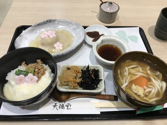 で、結局この日の昼食は奈良駅の「天極堂」JR奈良店で「椿の膳(2052円)」を頂くことに。葛うどんや葛掛けご飯などにデザートのくず餅まで付く葛フルコースである。ボリュームはそれほどでもないが、今の私にはちょうどぐらいか。