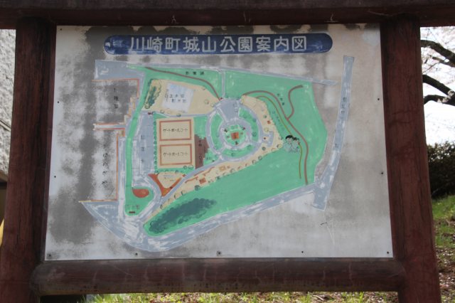 麓の集落を抜けた分岐のところに案内看板が立っており、その辺りに車を置くスペースがあるので駐車する。案内看板の記述に従って進んでいけば本丸にたどり着けるはず・・・なのだが、実はこの案内看板がトラップなのである。この看板によると現在地のすぐ近くに二の丸に上がるルートがあるように思うが、実はそれはハズレ。正解はもっと西に歩いて行った先なのである。注意ポイントは登り口の西に東屋の記述があるが、この周辺を見渡しても東屋が存在しないこと。登り口は実はここの脇ではなく、東屋の隣なのである。このことはこの近くに置いてある川崎町教育委員会による城の縄張り地図があるので、それを見れば良く分かる。この資料実によく出来ているので必ずもらっておくように。実際に裏を見ると、今日私がこれから訪問する予定の山城がすべて記載してある。