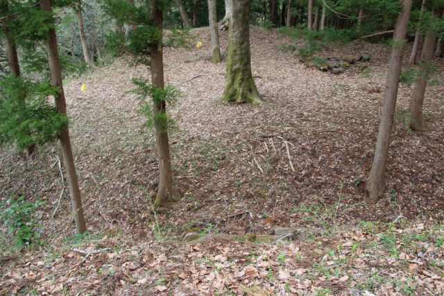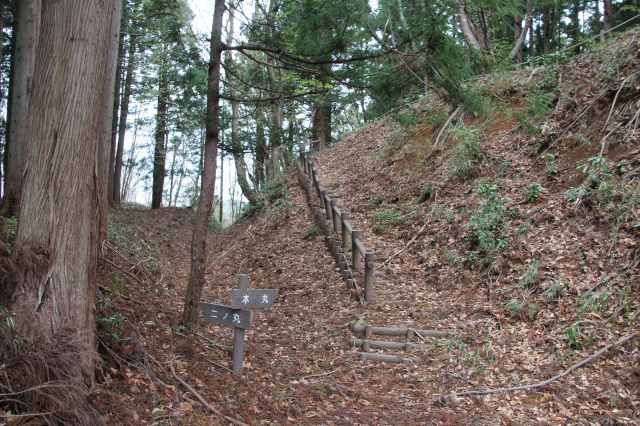 二の丸は杉林になっているが、そもそもは土塁で囲われた堅固な曲輪で、土塁の外にはかなり深い堀が取り囲んでいる。その先は切り立っているようであり、本丸の西側を守る独立曲輪となっている。