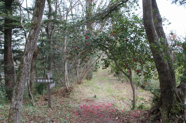 ここからは一般車は立ち入り禁止となっているが、明らかに整備用の軽トラが走行することを想定した舗装道路が本丸の手前まで続いている。進みきった先が本丸と二の丸の分岐。正面には本丸が見え、その手前には幅の広い見事な堀切が備わっている。まずは二の丸を見学する。