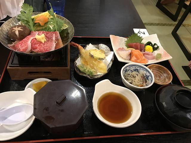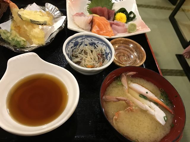 とりあえず部屋に荷物を置いたらすぐにレストランに行って夕食を摂ることにする。夕食は「万葉御膳」ということで、いわゆる旅館の夕食的なもの。まあ可もなく不可もなく、普通に美味しいと言うところか。鍋がすき焼きでもなく水炊きでもなく、ショウガの入ったサッパリ風味というのが独得。カニ入り味噌汁が意外に美味い。
