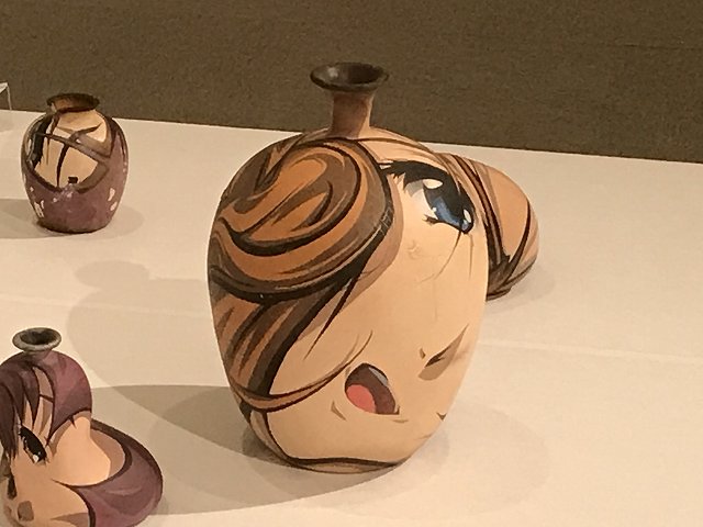 最後のコーナーは、小学校の図工の先生前光太郎こと乙うたろう氏の作品。アニメの少女の顔を壺に焼き付けた奇妙な作品群(見方によってグロテスクだ)が展示されている。一応「先生として働いている芸術家」という意味だとか(かなりこじつけクサい)。なお場内の説明に「美術家は多くの場合、作家活動と並行して、学校の教師などの別の側面を持っています」と記してあったが、そりゃ作家活動で食える奴はほとんどいないという意味だけではとも思うのだが・・・。