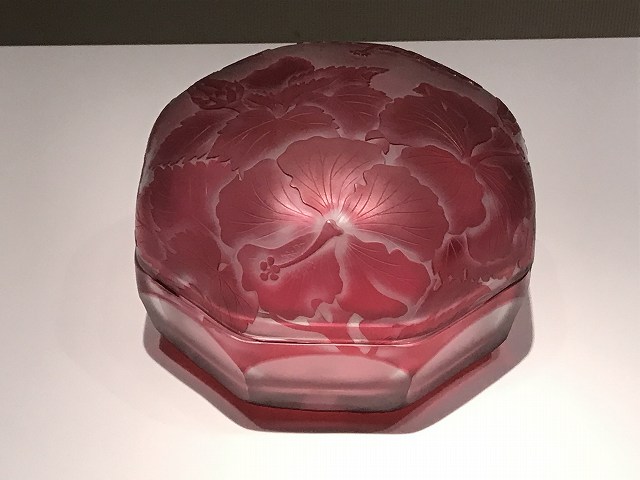 次に登場するのは青野武市のガラス工芸品。金粒子を使用した赤い絵付けの器(昔から金コロイドは赤色に使用される)や、紫の着色をしたものまで様々。澄んだガラスの工芸はドーム兄弟とかを連想させるが、不透明な植物紋の器などは明らかにガレを意識しているだろう。