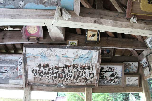 何とか賀茂神社まで無事に降りてくる。これで本日の山城攻略は終了である。とりあえず無事に下山の感謝を兼ねて賀茂神社に参拝しておく。境内にはなぜか赤穂浪士に関する絵が飾られているが、尼崎大合戦というのもある。いわゆる細川家の内紛に関する大物くずれのことだろうか?